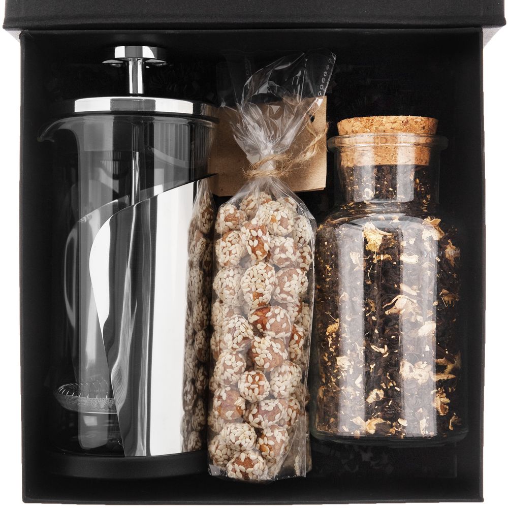 - Материал коробка - переплетный картон; чай - стекло, пробка; френч-пресс - боросиликатное стекло, нержавеющая сталь