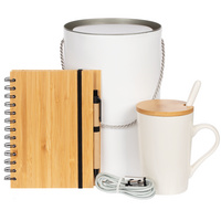 - Материал кружка с ложкой - фарфор, нержавеющая сталь, бамбук; кабель - алюминий, нейлон, искусственная кожа; блокнот с ручкой - бамбук, картон, пластик; тубус - переплетный картон, жесть