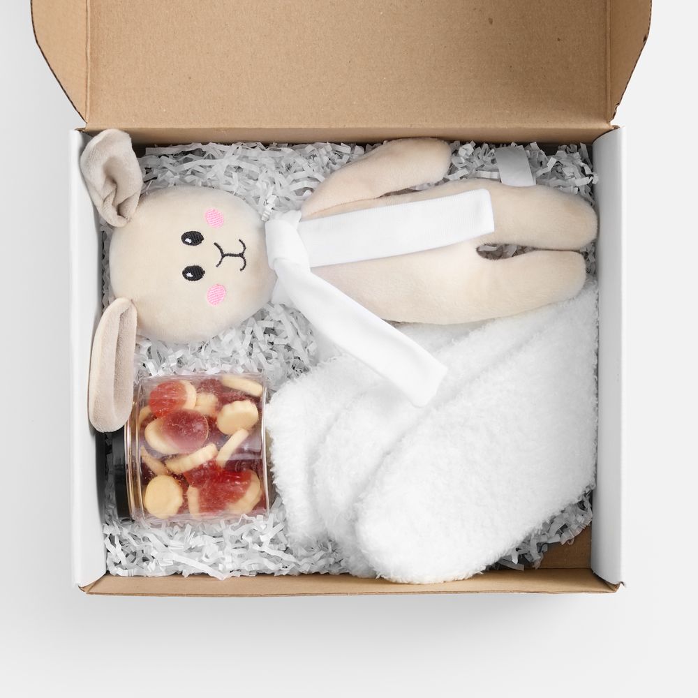 - Материал коробка - микрогофрокартон; носки - полиэстер 100%; игрушка - велюр, полиэстер; упаковка мармелада - пластик