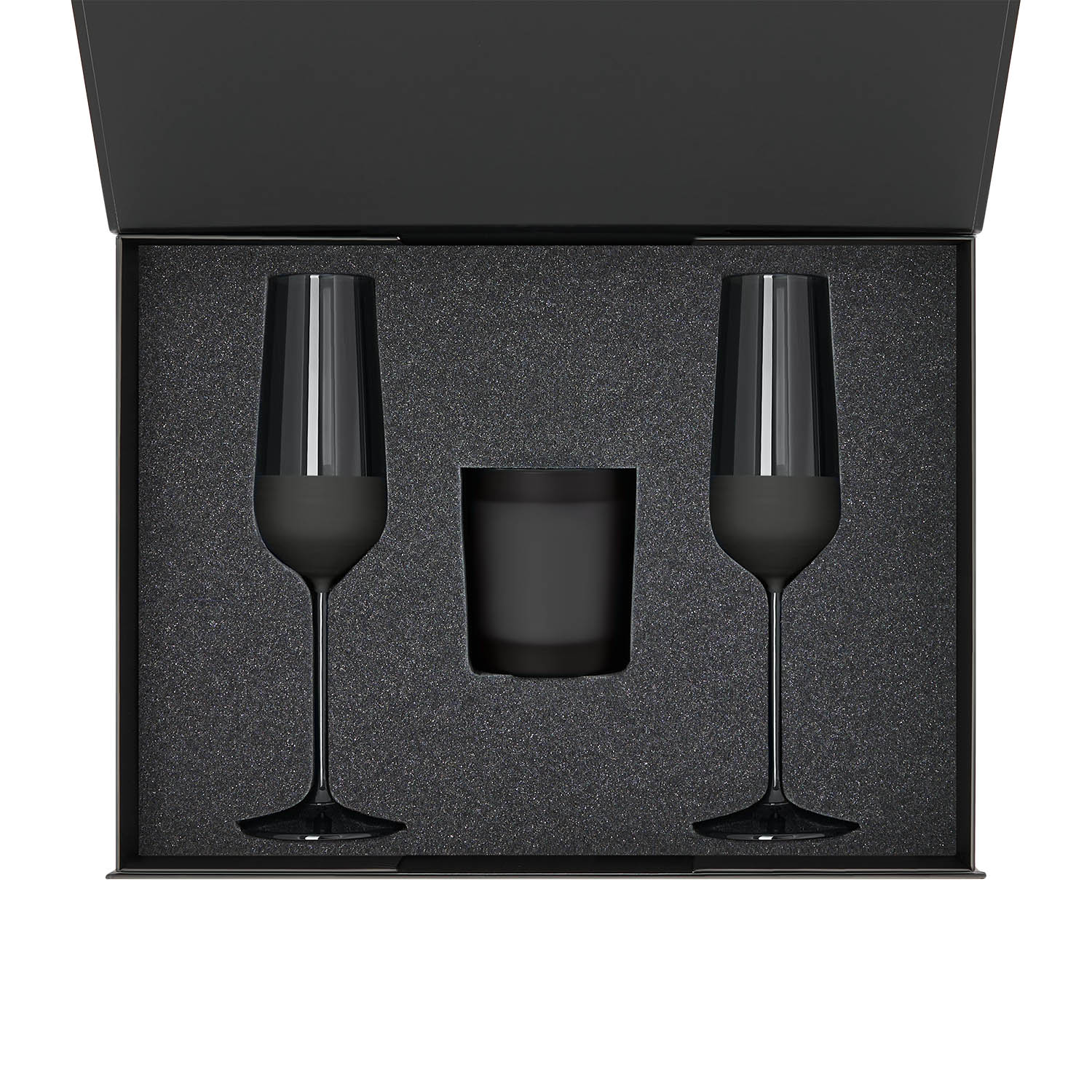 Подарочный набор свеча Enigma + 2 бокала для шампанского Black Edition в черной коробке