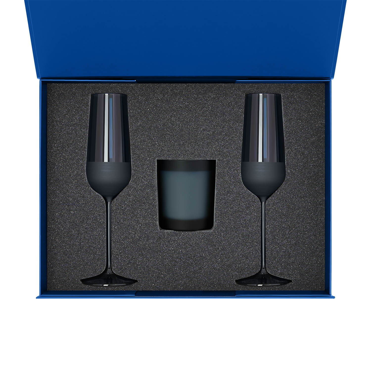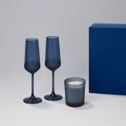 Подарочный набор свеча Enigma + 2 бокала для шампанского Sapphire в синей коробке