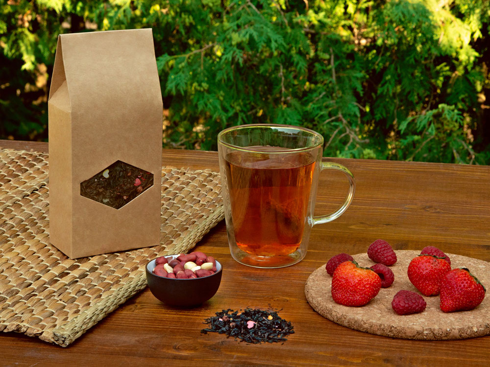- Состав клубника, малина, чай черный индийский ОРА, посыпки кондитерские, арахис, ароматизатор