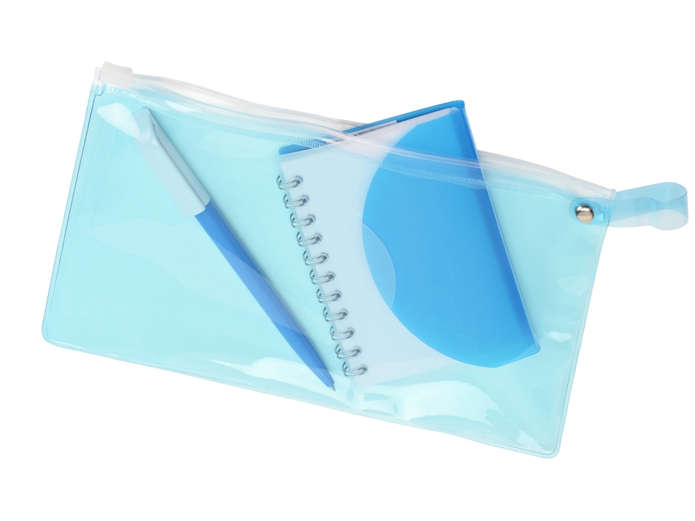 Цвет: блокнот- прозрачный/голубой, ручка- голубой/белый, пенал- голубой прозрачный