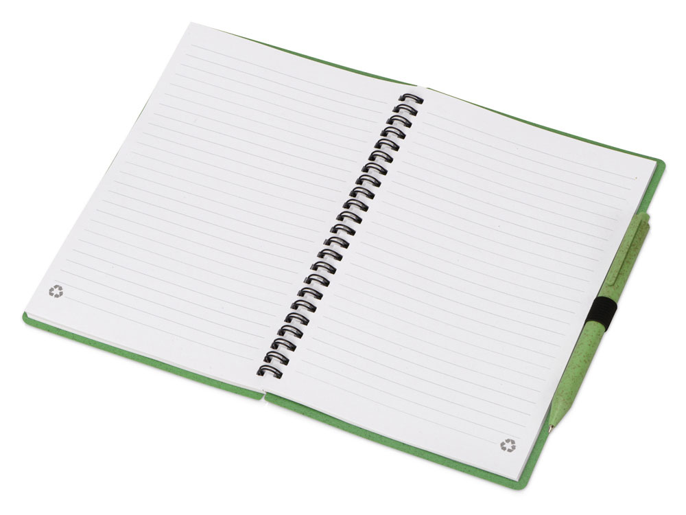 - Материал товара блокнот- пластик, переработанная бумага, металл, ручка- пшеничное волокно, пластик