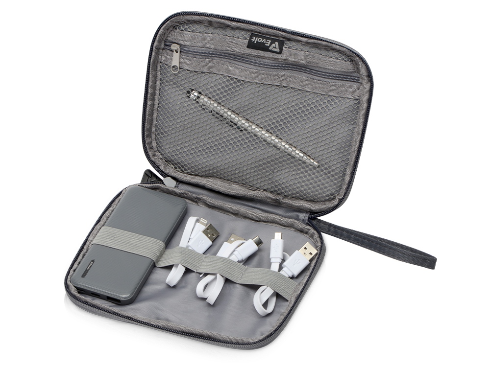 - Комплектность органайзер для проводов 18 х 14 х 2 см, внешний аккумулятор 5000 mAh 5,6 х 12,1 х 1,3 см, ручка-стилус шариковая d0,8 х 12,8 см