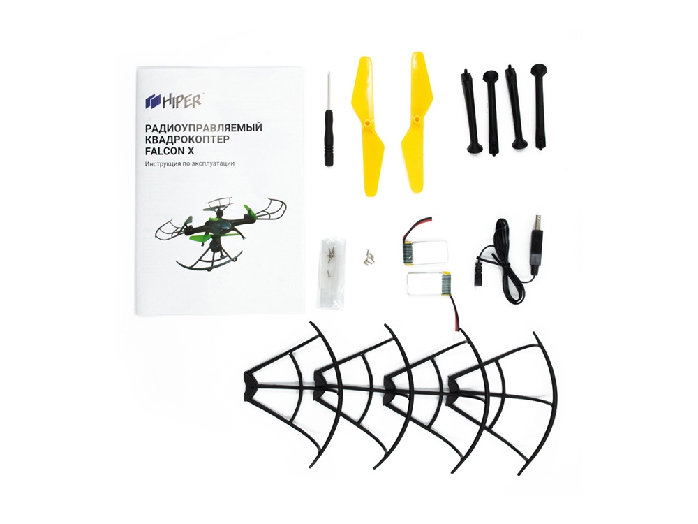 - Комплектность квадрокоптер, ПУ, аккумулятор- 2шт, USB кабель, запасные лопасти, запасные винты, стойка шасси- 4шт, защита пропеллеров, отвертка, инструкция
