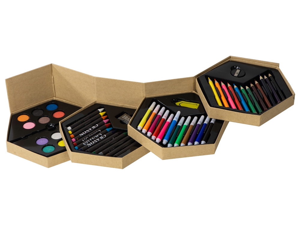 - Комплектность маркер - 12шт, цветные карандаши - 12шт, восковые карандаши - 12шт, акварельные краски - 12шт, кисточка, точилка, ластик, скрепка