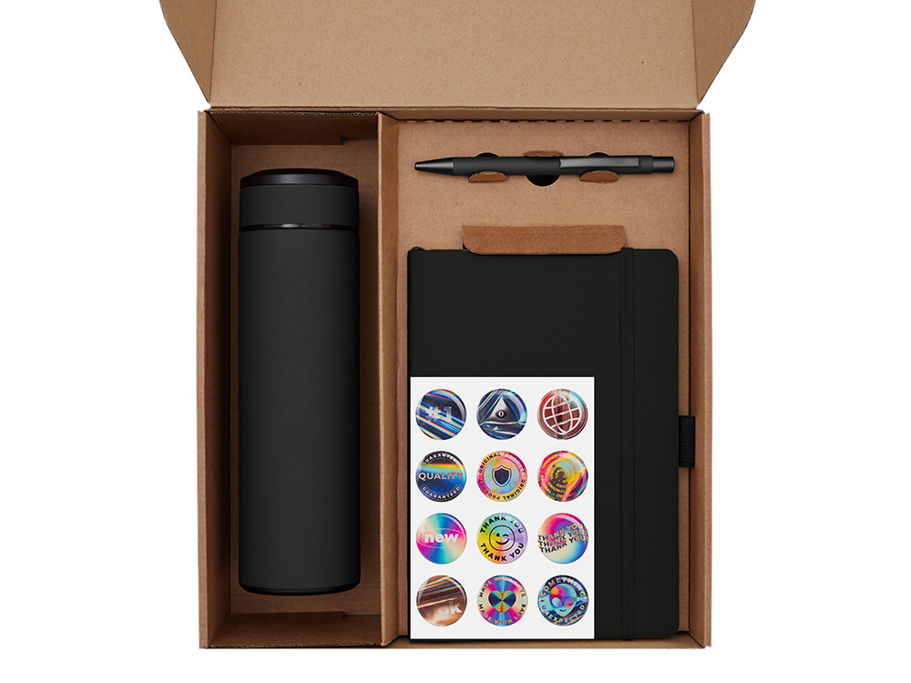 - Материал товара термос - нержавеющая cталь с покрытием soft-touch, блокнот - искусственная кожа soft-touch, ручка - металл с поверхностью soft-touch, чай - крафт-пакет, стикеры - смола, держатель для телефона - пластик, коробка - картон