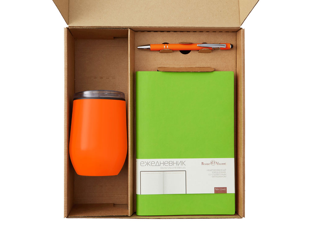 - Материал товара ежедневник - искусственная кожа, термокружка - нержавеющая сталь снаружи, полипропилен внутри, ручка - металл c покрытием soft-touch, ситечко - нержавеющая cталь