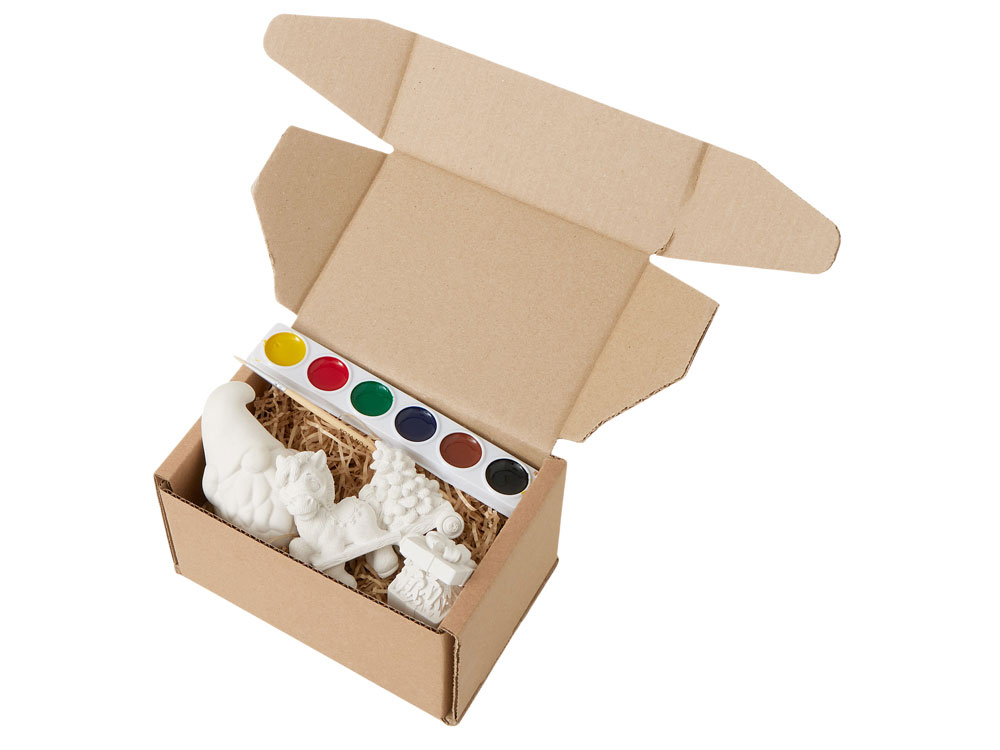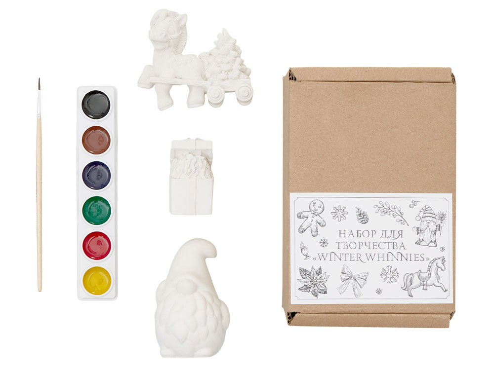 - Комплектность 3 гипсовых фигурки, акварельные краски, 1 кисточка